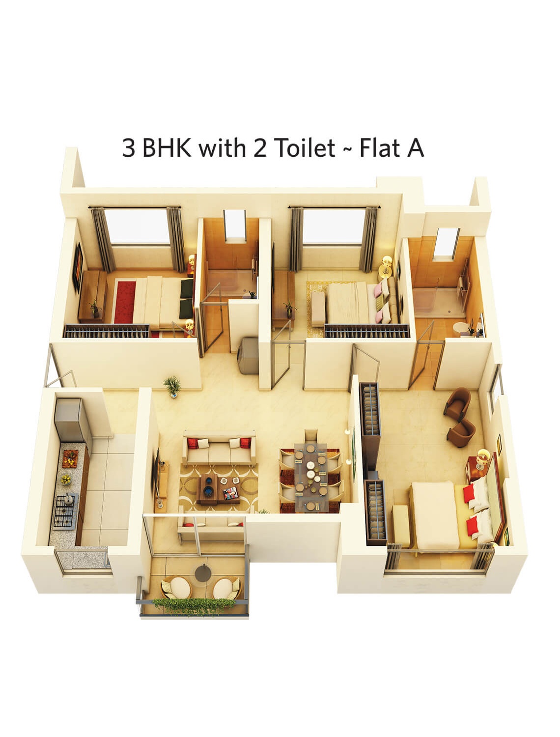 Vitrified tiles in all bedrooms, living / dining rooms